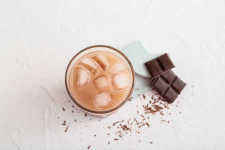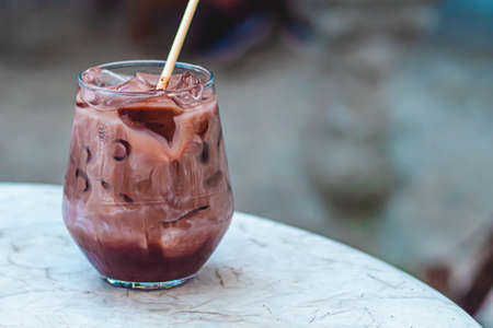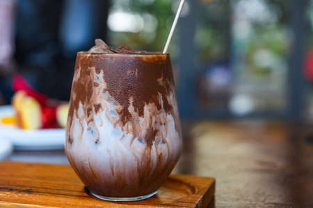 Summer refreshment drinks. Chilled iced chocolate cocoa. Chocolate powder and ice with tubes for drinking in the cafe. Copy space.