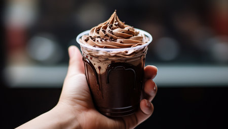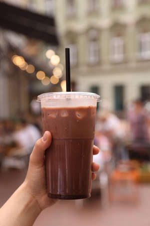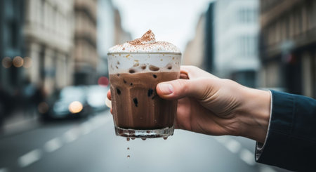 Hand holding iced chocolate drink with whipped cream and cocoa powder on World Chocolate Day. Refreshing cold beverage for street scene.