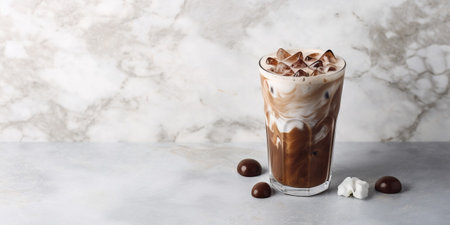 Iced cocoa in clear glass on marble, copy space for your text : Generative AI