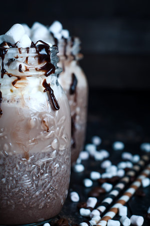 Chocolate shake with dripping sauce and marshmallows on dark background