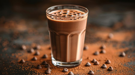 A rich chocolate drink in a glass with cocoa powder and chocolate chips.