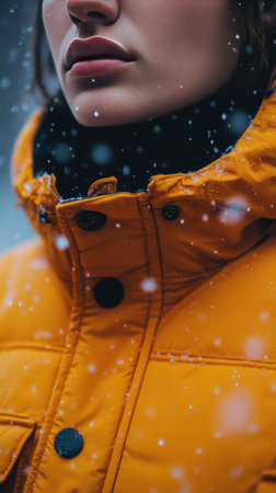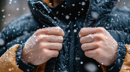A person stands in a snowy city, adjusting their winter jacket as snowflakes fall around them. The scene captures the chill of a winter day and the warmth of winter clothing.