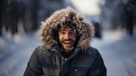Portrait of a young man in a snowy winter forest. He is laughing.