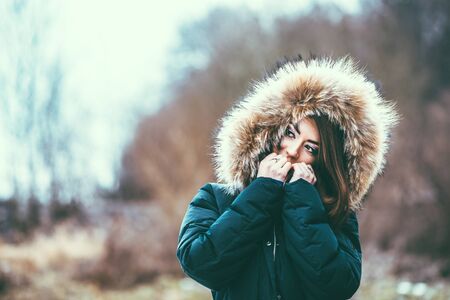 Portrait of woman wearing warm coat with fur hood, having fun in winter