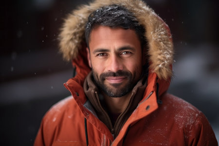 Muslim man headshot portrait looking at camera, wearing winter outfit in outdoors