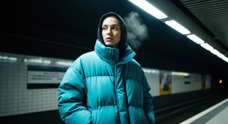 Portrait of a young woman in a blue down jacket on the platform of a subway station