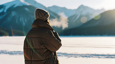 Man in warm clothes standing in front of frozen lake and smoking cigarette