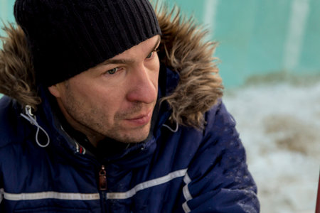 Portrait of a bearded man in winter clothes on a snowy day