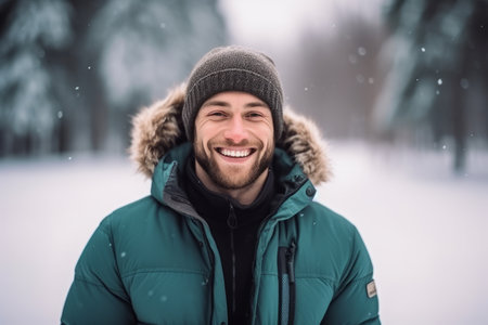 Portrait of a smiling young man in winter clothes in the snow