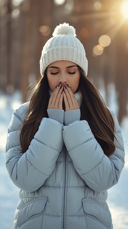 Woman with freckles in winter clothes outdoors enjoys winter