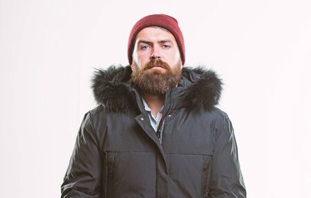 Hood adds warmth and weather resistance. Man bearded stand warm jacket parka isolated on white background. How to choose best winter jacket. Weather resistant jacket concept. Winter season menswear