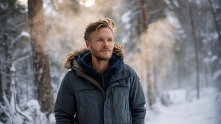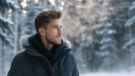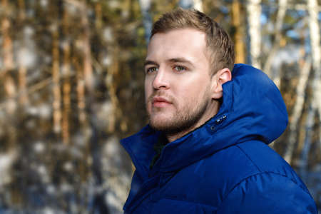 Portrait of a young man in a jacket with a hood. Man stands in winter forest.