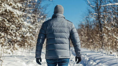 a man in a gray down jacket in a snowy field