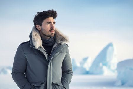 Handsome young man in winter clothes looking away against icebergs