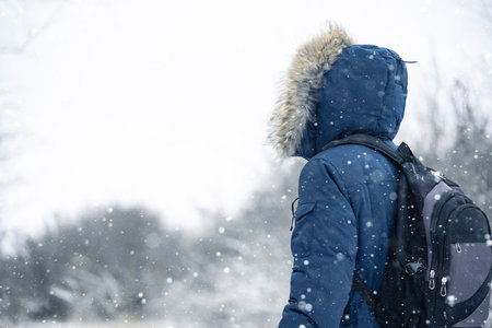 Back view of traveler in a blue jacket with a fur hood and a backpack on the background of a winter landscape during snowfall