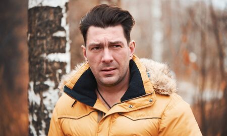 Portrait of a handsome young man in a red jacket in winter