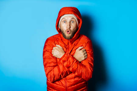 man feel cold in winter at holidays wearing hood. man in cold winter wear jacket. man in cold winter