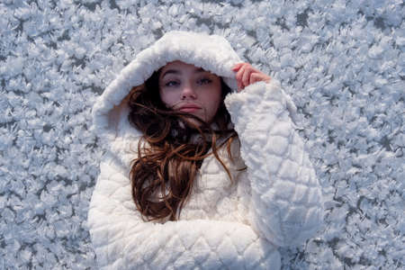 portrait of beautiful, young, sexy, cute, brunette woman, freezing in the cold winter in white coat and hood, lying surreal like standing on the frozen lake, surrounded by ice crystals, copy space