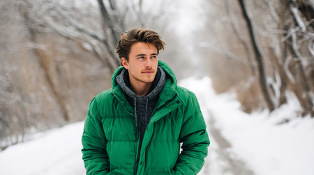 Happy young man in a warm jacket and hat standing in a snowy park.