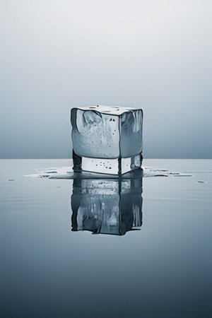 Ice cube on the water with a reflection of the sky and clouds