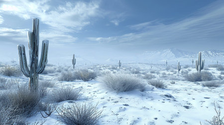Winter landscape with Joshua trees and snowy rock formations