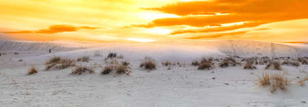 Golden sunset over white sands national park, with gypsum sand. Figure walking on dunes for scale.
