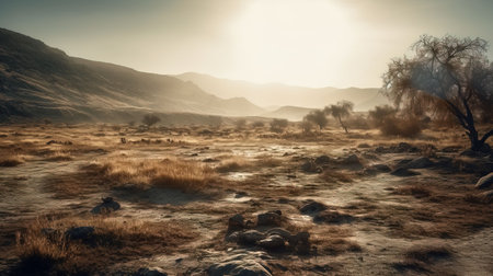 wideangle panoramic drone shot of dead trees in hot sand desert with sun
