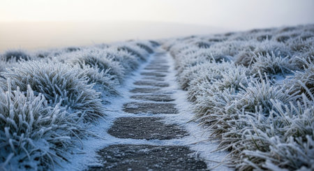 Frosted path on a cold winter morning in the countryside.