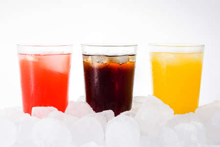 Three different colored drinks are displayed on a white surface, Icy drinks sweating in the heat