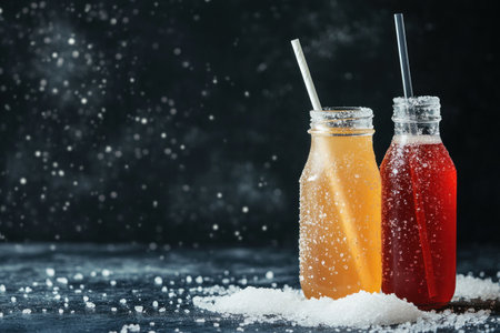 Kombucha in a glass jar and bottle with a straw, red sugar cane juice on the right side of the photo, white salt crystals on the tabletop, dark background, product photography. --ar 3:2 --v 6.1 Job ID: 65aa311c-3985-4f52-998f-509f0e8a51fe