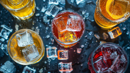 Refreshing drinks with ice arranged on a gray surface from an overhead view, allowing space for text in the center.