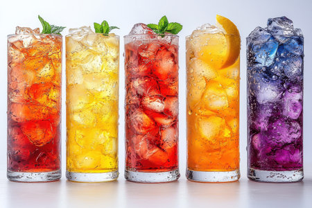 Discover a vibrant arrangement of colorful drinks in glasses, showcasing refreshing beverages with ice, perfect for summer parties and celebrations.