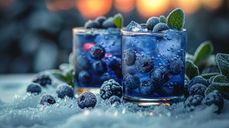 Two glasses filled to the brim with fresh blueberries and ice cubes, creating a refreshing and colorful drink.