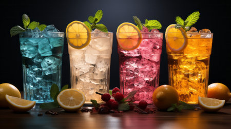 AI Generated. Refreshing Colorful Summer Drinks in Tall Glasses with Citrus and Mint Garnishes
