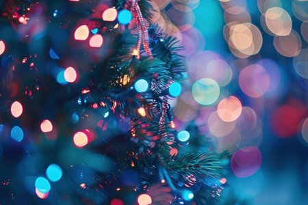 A close-up view of a Christmas tree with vibrant lights creating a magical bokeh effect. This festive image captures the warmth and joy of the holiday season.