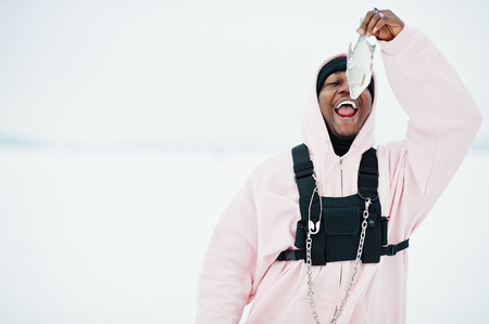 African american fisherman with fresh frozen fish at hand. Winter fishing.