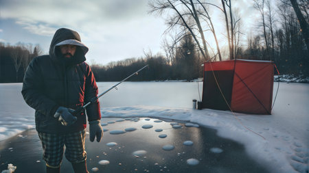 Angler Fishing in Snowy Winter Landscape Beside Icy Lake During Cold Morning. Concept of Outdoor Adventure, Winter Activities, Tranquil Nature Scene.