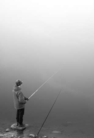 Meeting of a young fisherman on the lake in foggy weather. The atmosphere of calm and loneliness in black and white photography.