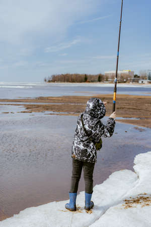A fisherman with a fishing rod and a backpack catches fish on the bank of a snow-covered river in early spring.
