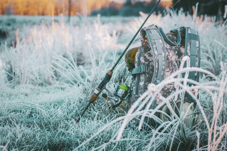Fishing tackle covered with hoarfrost. Fishing.
