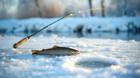 Freshly caught fish lying on the ice beside a fishing rod during winter fishing. Concept of ice fishing, outdoor adventure, winter sports, and catching fish through ice.