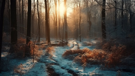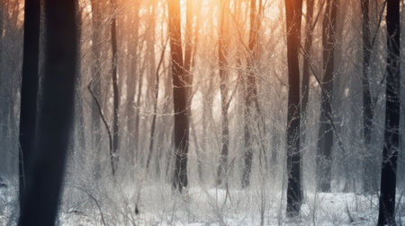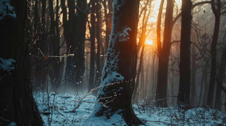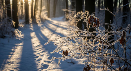 A frosty winter scene in a forest at sunrise. Snow covers the branches and ground, creating a beautiful and peaceful atmosphere.