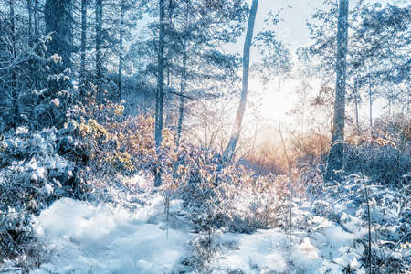 Magical winter sunset in frozen snowy forest.