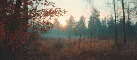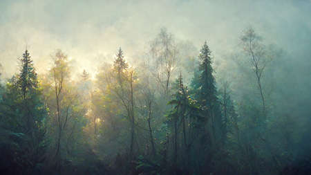 Mystical forest landscape in autumn morning fog. Scenery in dreamy foggy forest. Digital art.