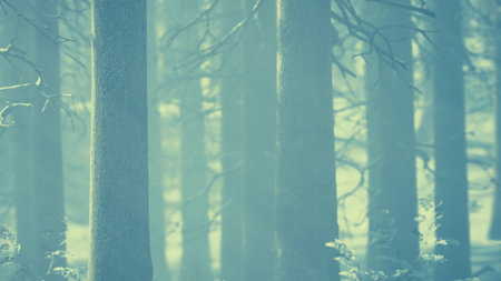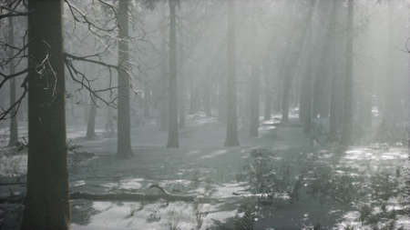 Winter forest landscape. Mighty trees. Atmospheric landscape. Climate change, nature, environmental conservation. Europe. Panoramic view