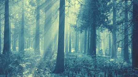 Misty fog pine forest mountain slopes color toning