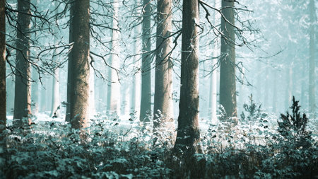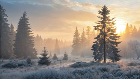 Evergreen trees blanketed in frost create a tranquil winter scene, surrounded by mist and soft light, showcasing the beauty of nature's winter landscape