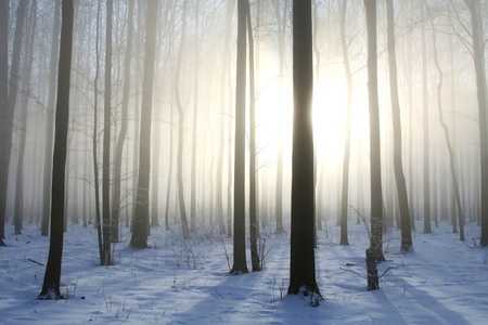 Winter deciduous forest on a foggy December s morning
