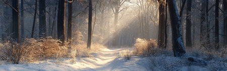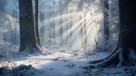 A mesmerizing image ideal for seasonal publications, environmental pieces, holiday cards, or as a breathtaking backdrop in any space that years for a touch of nature's tranquility | This image invites viewers into a serene winter wonderland where the silence is almost audible. Sunlight streams through the dense forest canopy, casting elongated shafts of light that pierce the chilled air, illuminating the frost-encrusted branches and carpet of snow below. The trees, cloaked in hoarfrost, stand as silent sentinels in the hushed woods, their trunks dark and stark against the soft glow of the forest floor. The play of light and shadow creates a spellbinding pattern, evoking a sense of magic and stillness. This scene captures the dual essence of winter: its bone-chilling cold and its unique, quiet beauty. The juxtaposition of the sun's warmth in appearance and the evident cold accentuates the resilience of nature during the harshest of seasons. The delicate frost on the twigs and the light dusting of snow convey a fragile, almost ethereal quality, which contrasts the enduring, solemn trees. Natural light is the artist here, transforming an everyday woodland scene into a moment of extraordinary spectacle | Perfect for environmental campaigns emphasizing the importance of preserving natural winter habitats, in travel and tourism to promote winter destinations or as an inspiration for artistic and creative works. The image provides a sanctuary of peace for those seeking solace in the soothing scenes of nature and can effectively be used to enrich web designs, digital art, or as a meditative visual for wellness spaces | a detailed photograph of a snow-covered forest with sunlight filtering through the trees, highlighting the textures of frost and snow and the interaction between light and shadow, with space for textual additions or graphical design elements