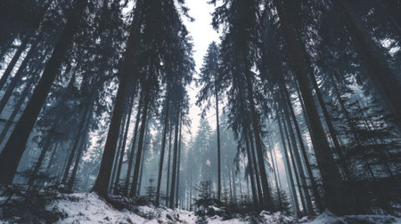A captivating misty forest scene showcasing evergreen trees draped in fog, creating a serene atmosphere perfect for nature lovers and outdoor enthusiasts seeking tranquility.